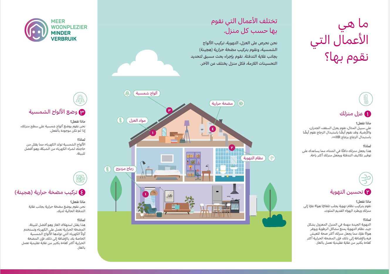 نريدك أن تعيش بشكل مريح واقتصادي في منزل يستخدم طاقة أقل. كما أن استخدام طاقة أقل يتماشى أيضاً مع الاتفاقيات المبرمة بين هولندا وأوروبا للعيش بشكل أكثر استدامة أو بعبارة أخرى للعناية بالبيئة بشكل أفضل